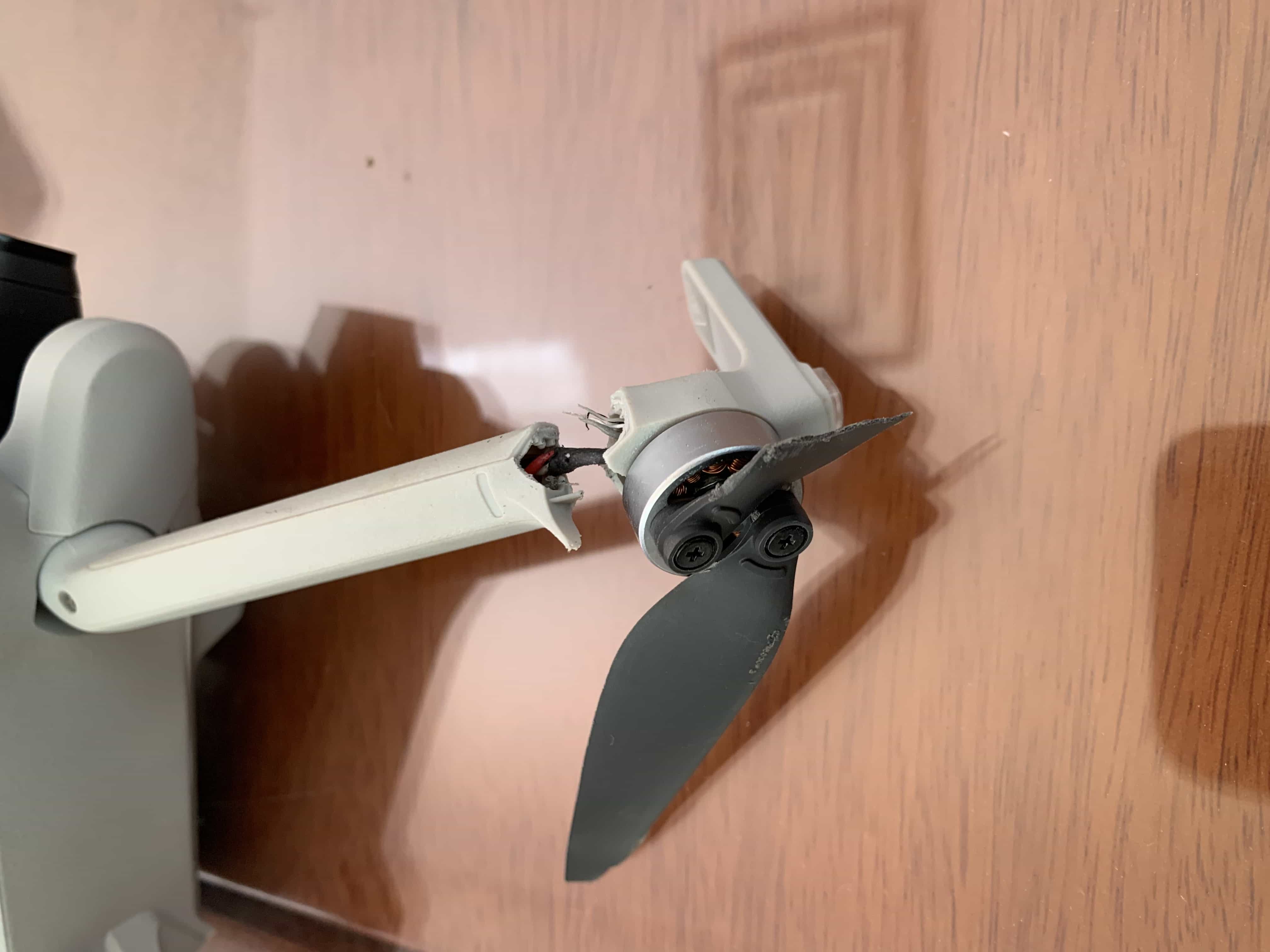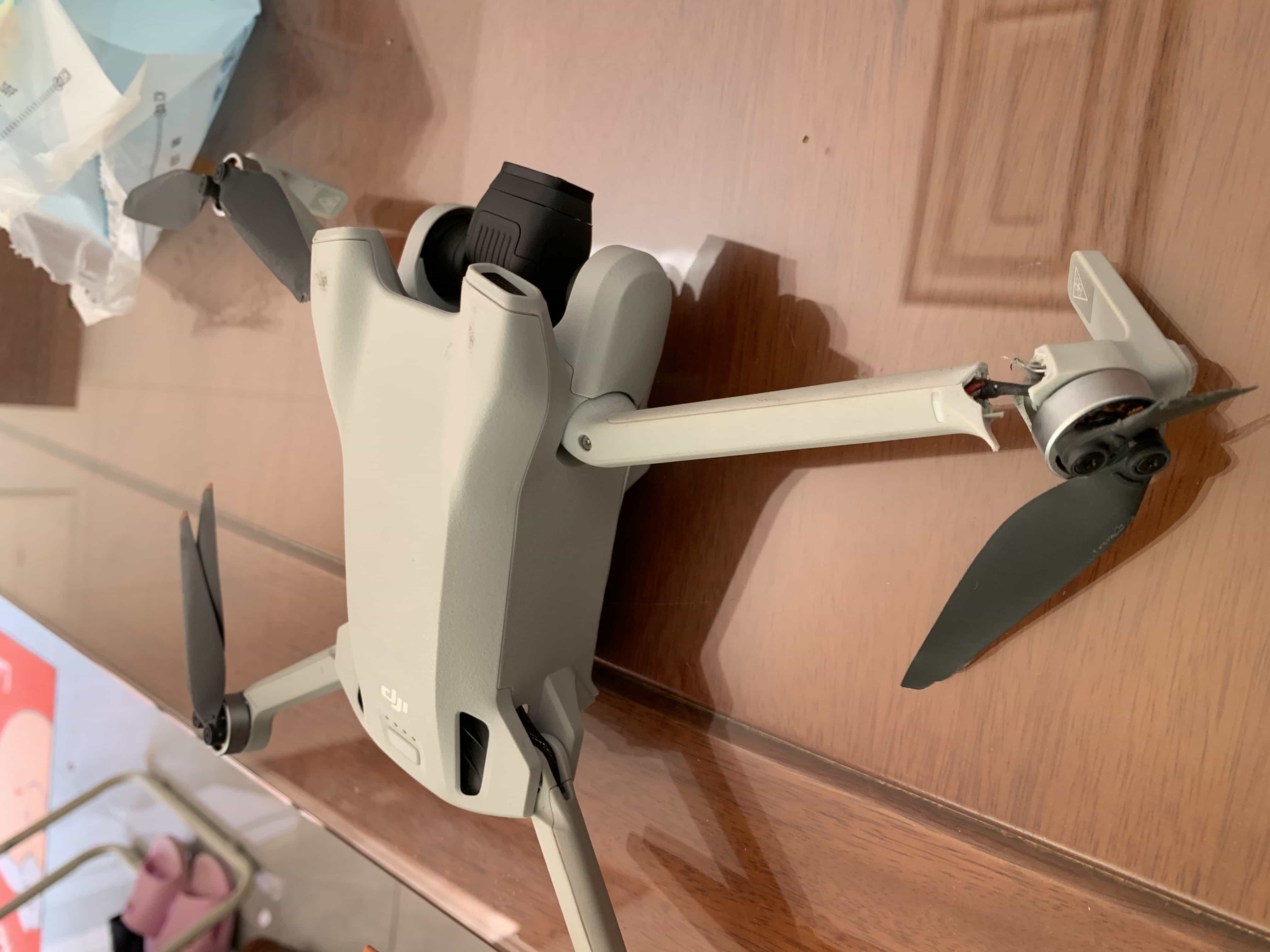 陪伴我317天的DJi mini 3撞击三楼阳台防盗网致使飞机从高空坠落到一楼,造成飞机前右臂靠近螺旋桨的机臂断裂、八片螺旋桨叶片均有不同程度的断裂与磨损、云台下方机身外壳有细微开裂。